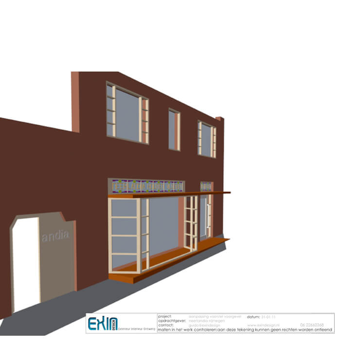 Voor de winkelruimte van Neerlandia Houten Vloeren heb ik een conceptvoorgevel uitgewerkt.